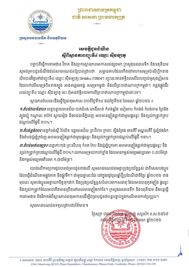 ក្រសួងធនធានទឹក និងឧតុនិយម សូមជម្រាបជូនដំណឹងស្ដីពីស្ថានភាពព្យុះទី៤ ឈ្មោះ ស៊ីនឡាគូ ចាប់ពីថ្ងៃទី១៤ ដល់ថ្ងៃទី២៥ ខែមេសា ឆ្នាំ២០២៦។