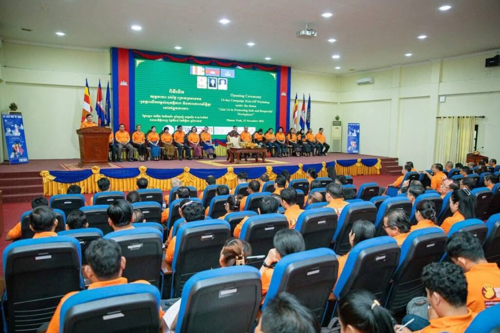 ពិធីបើកយុទ្ធនាការនាឱកាសនេះ ប្រារព្ធឡើង ក្រោមអធិបតីភាព ឯកឧត្តម ហេង សួរ រដ្ឋមន្រ្តីក្រសួងការងារ និងបណ្ដុះបណ្ដាលវិជ្ជាជីវៈ ក្នុងគោលបំណង ដើម្បីលើកកម្ពស់ការយល់ដឹង ពង្រឹងកិច្ចខិតខំប្រឹងប្រែងក្នុងការទប់ស្កាត់ និងជំរុញវិធានការ ដើម្បីឆ្លើយតបទៅនឹងអំពើហិង្សា និងការបៀតបៀននៅកន្លែងធ្វើការ ដោយរំលេចនូវការប្ដេជ្ញាចិត្តរបស់គ្រប់ភាគីពាក់ព័ន្ធ ក្នុងការបង្កើតវប្បធម៌សុវត្ថិភាព សេចក្ដីថ្លៃថ្នូរ និងការគោរពគ្នា ក្នុងវិស័យការងារនៅកម្ពុជា ជាពិសេសគឺវិស័យវាយនភណ្ឌ កាត់ដេរ ផលិតស្បែកជើង និងផលិតផលិតផលធ្វើដំណើរ និងកាបូប។