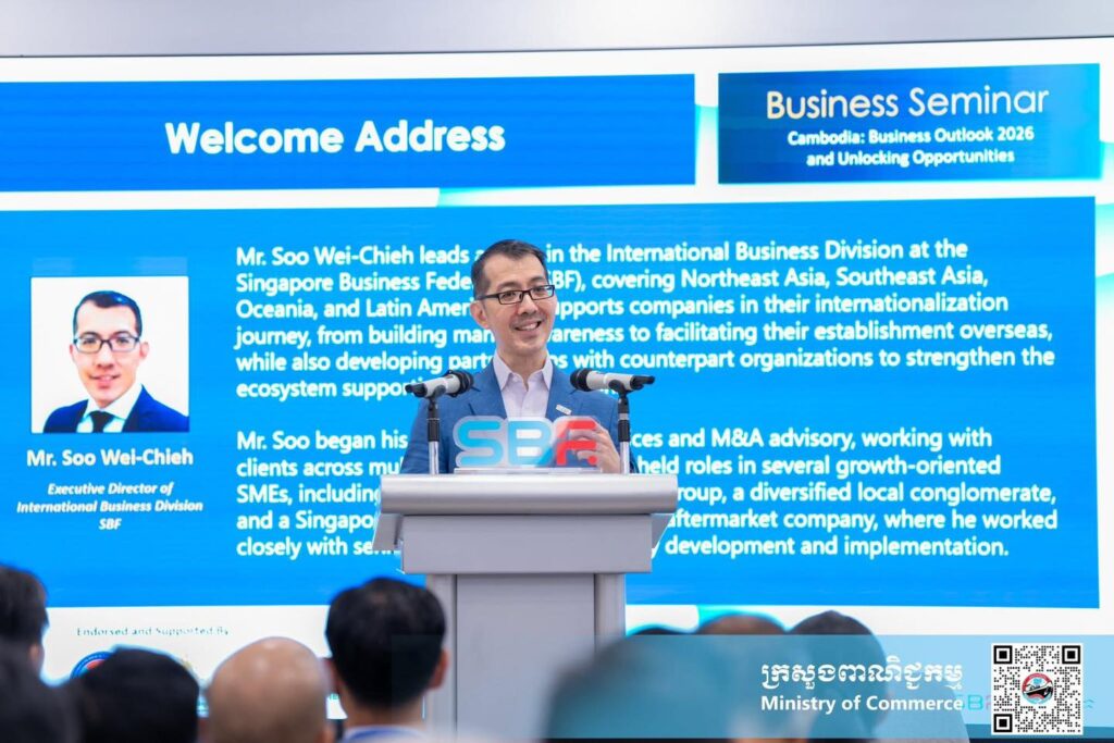 លោកជំទាវរដ្ឋមន្ត្រី បានលើកឡើងបែបនេះ នាឱកាសដែល លោកជំទាវ ដឹកនាំគណៈប្រតិភូកម្ពុជា ចូលរួមសិក្ខាសាលាធុរកិច្ចស្តីពី “កម្ពុជា៖ ទស្សនវិស័យធុរកិច្ចឆ្នាំ២០២៦ និងឱកាសធុរកិច្ច–Cambodia: Business Outlook 2026 and Unlocking Opportunities” ដែលរៀបចំឡើងដោយ សហព័ន្ធធុរកិច្ចសិង្ហបុរី (Singapore Business Federation) ក្រោមកិច្ចសហការជាមួយក្រុមហ៊ុន Aquarii BD Cambodia និងមានការចូលរួមពីធុរជនកម្ពុជា តំណាងវិស័យឯកជនសិង្ហបុរី និងសមាជិកសហព័ន្ធធុរកិច្ចសិង្ហបុរី វិនិយោគិន ធុរជន ព្រមទាំងដៃគូពាណិជ្ជកម្មជាច្រើនរូប ដើម្បីស្វែងយល់អំពីសក្តានុពលសេដ្ឋកិច្ចកម្ពុជា និងពិភាក្សាអំពីឱកាសសហប្រតិបត្តិការ ក្នុងវិស័យអាទិភាព រួមមាន៖ ភស្តុភារកម្ម និងការគ្រប់គ្រងខ្សែច្រវាក់ផ្គត់ផ្គង់, កសិ-ឧស្សាហកម្ម និងការកែច្នៃម្ហូបអាហារ, សេដ្ឋកិច្ចឌីជីថល, និងឧស្សាហកម្មតម្លៃបន្ថែមខ្ពស់ ជាដើម។