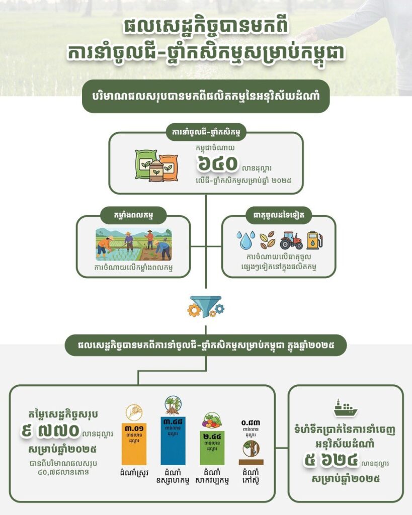 “ផលសេដ្ឋកិច្ចទទួលបានពីការប្រើប្រាស់ធាតុចូលជីកសិកម្មទាំងនេះ បានបង្កើតជាតម្លៃសេដ្ឋកិច្ចរហូតដល់ ៩៧៧០ លានដុល្លារ នៅក្នុងឆ្នាំ២០២៥  ដោយមិនត្រឹមតែបានធានាសន្តិសុខស្បៀងប៉ុណ្ណោះទេ តែថែមទាំងអនុញ្ញាតឱ្យកម្ពុជាទាញយកចំណូលពីការនាំចេញកសិផល រហូតដល់ទៅ ៥៦២៤ លានដុល្លារ ផងដែរ។