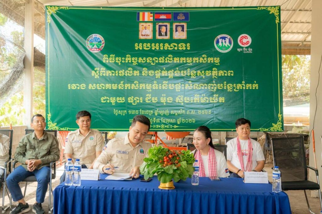នៅថ្ងៃទី៣ ខែមេសា ឆ្នាំ២០២៦ ឯកឧត្តម ឃឹម ហ្វីណង់ អនុរដ្ឋលេខាធិការ និងជាអ្នកនាំពាក្យក្រសួងកសិកម្ម រុក្ខាប្រមាញ់ និងនេសាទ បានអញ្ជើញជាអធិបតីក្នុងពិធីចុះកិច្ចសន្យាផលិតកម្មកសិកម្មក្នុងការផលិត និងផ្គត់ផ្គង់បន្លែសុវត្ថិភាព រវាងសហគមន៍កសិកម្មទំនើបបន្លែផ្ទះសំណាញ់ត្រាំកក់ ជាមួយលោកជំទាវ លី សុខឆេង អគ្គនាយកាក្រុមហ៊ុន ជីប ម៉ុង វីថែល នៅស្នាក់ការសហគមន៍កសិកម្មទំនើបបន្លែផ្ទះសំណាញ់ត្រាំកក់ ខេត្តតាកែវ។